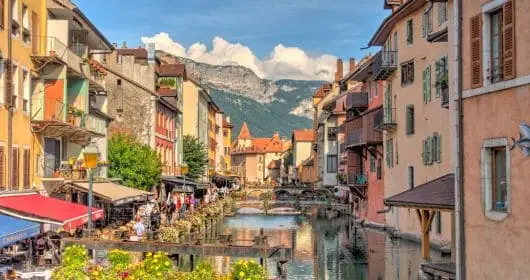 3. Annecy: The city is famous for being the Venice of the Alps, with canals, beautiful architecture, a lake, and an international animated film festival. It has old towns, mouthwatering local cuisines like famous cheese reblochon, and many more. The city is considered to be one of the cheapest cities where you can try outdoor water activities like swimming, boating, and watching the sunset from a boat, which gives a beautiful scenic view from there. Because of how convenient this city is, and thats the reason behind people choosing this as one of the top places to visit in France. This place is a famous food location that makes every foodie come. Tourists love the place due to the delicious ancient food dishes. The places that you should not miss while visiting the city are the Lake Annecy cruise, the Chateau d'Annecy, and exploring the old town.